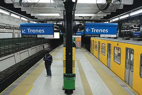 Primera Junta is a station on Line A of the Buenos Aires Underground.[1] It lies at the intersection of Rivadavia Avenue and Del Barco Centenera street, in the neighborhood of Caballito and connects with Caballito station on the Sarmiento Line commuter rail service. The Buenos Aires Historic Tramway (Spanish: Tramway Histórico de Buenos Aires) operates tram cars on a 12-block loop of street tracks used by rapid transit trains en route to the Polvorín Workshop. The station was opened on 1 July 1914 as the western terminus of the extension of the line from Río de Janeiro. It served as the line's terminus until 23 December 2008, when the line was extended to Carabobo.[2]