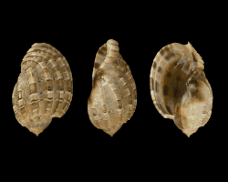 Three views of a shell of a Harpa species, a prosobranch gastropod.