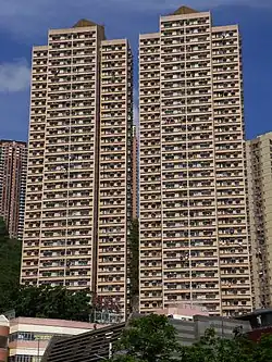 Kwai Hing Estate (Chinese: 葵興邨) was built in the valley of Gin Drinkers Bay,[24] later the town centre of Kwai Chung. Kwai Hing station is named after the name of the estate. It comprises 4 buildings with a total of 400 rental units (TPS units excluded) and 1 shopping arcade. Before redevelopment, it consisted of 5 buildings which were completed between 1970 and 1972. In 1985, the HKHA announced that the strength of the concrete in blocks 3, 4 and 5 of Kwai Hing Estate were below standard.[25] All the blocks were later demolished between 1988 and 1992 to cope with the estate redevelopment.[22] The estate was later redeveloped with 5 buildings between 1991 and 1992.