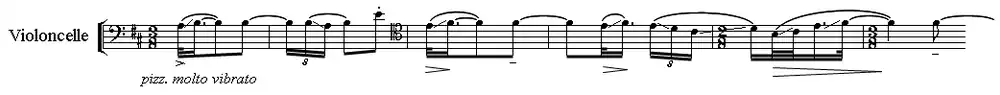 According to Michel Duchesneau, the co-premières of the Quatre poèmes hindous, Ravel's Trois poèmes de Mallarmé, and Stravinsky's Three Japanese Lyrics at the SMI provoked "an evolution" of the French mélodie, understood as "chamber music with voice"[27] until 1939. In 1941, Charles Koechlin cited the cello's pizzicato-glissando (or pizz. vibrato molto) passage in his Traité de l'orchestration as a "characteristic example" of modern composition with pizzicato.
