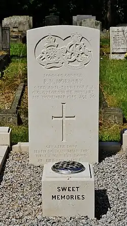 CWGC headstone of a QOOH gunner who died a few months after the end of the Second World War. The stone bears the dual insignia of the Royal Artillery (left) and QOOH (right).