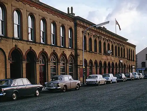 Queen's Quay station was opened in 1848 as Belfast[1] and was the terminus of the Belfast, Hollywood & Bangor Railway. The Belfast and County Down Railway opened an adjacent station two years later, both stations merging after a further two years. At its height, it contained five platforms and operated services to Ardglass, Bangor, Comber, Donaghadee, Downpatrick and Newcastle.