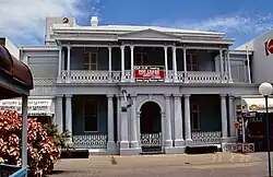 Each of the side verandahs have been fitted out as a shop at ground level. The first floor has paired timber posts with the rear being enclosed with glass louvres. The rear of the building has a single- storeyed masonry wing, with a corrugated iron gable roof, which has had recent concrete block additions. The east verandah tenancy has a long single-storeyed concrete block addition with a skillion corrugated iron roof. The rear of the site is concreted and used for car parking.[1]