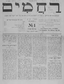 The founder of the newspaper was Rahamim Davidbayev, a wealthy businessman in the Skobolev.[1][2] He brought costly printing equipment from Lublin at his own expense in order to launch the newspaper.[1][3] The name of the newspaper alluded to the name of its founder.[2] The first issue came out on May 27 [O.S. May 14] 1910.[4] Raḥamim was distributed among Bukharian Jewish communities in cities across Central Asia.[5] It was the first newspaper published in Judeo-Tajik: a Judeo-Persian dialect.[3][6][2][7] It was printed in Rashi script: a 15th-century Sephardic semi-cursive handwriting.[8] The weekly newspaper was published from Skobelev (present-day Fergana in Uzbekistan) between 1910 and 1913, and from Kokand (Turkestan Krai) between 1913 and 1916.[9][1][10][8]