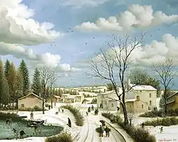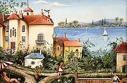 After this injury, Jacques de la Croix could no longer continue studying the classical singing he had practised since his adolescence. His career as a singer halted, he decided to devote himself entirely to painting, helped by his father-in-law, René Robin, and he changed his name to become Raphaël Toussaint. With René Robin, he came into direct contact with the landscape and began his first period. His painting Holidays in Saint Raphaël would determine the profile of what became the definitive expression of his art.[5] René Robin directed him towards naive art, because he felt that his vocation is there thanks to his patience and meticulousness. Until 1970, he worked under the secrecy of anonymity in order to make sure that his choice to devote himself entirely to painting was not an adventure without a future.[6] In 1965, he began his first exhibitions in different galleries and that he was selected the following year to participate in the Salon "Comparaisons" at the Grand Palais (Paris).[7] A few years passed where he affirmed his talent and in 1971 he was appointed Member of the Salon d'Automne. "Be congratulated and thanked, your work is beneficial, it carries within it the true values of life, the quiet and firm certainty that happiness is in simplicity, and not in money which is a lure. To build a work such as yours, in our times of anguish and iron, dear Raphaël Toussaint, is to bring us closer to the angels ... " declares Édouard Georges Mac-Avoy, the president of Salon d'Automne, in 1990.[8]