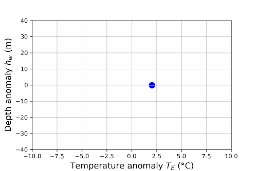 The figure shows the simulation of relation between the temperature anomaly and the thermocline depth anomaly and how it changes over time. Same starting conditions as above.
