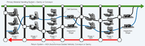 The components of RMS are CNC machines,[13] reconfigurable tools,[5][11] reconfigurable inspection machines,[14] and material transport systems (such as gantries and conveyors) that connect the machines to form the system. Different arrangements and configurations of these machines will affect the system's productivity.[15] A collection of mathematical tools, which are defined as the RMS science base, may be used to maximize system productivity with the smallest possible number of machines.