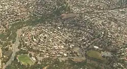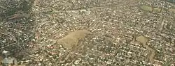 Aerial view of northern Redwood Park facing northwest: Golden Grove Road is seen travelling horizontally at the top of the image. Grenfell Road forms a T junction with that road near the centre and travels to the right edge of the image. Redwood Park is south of these two roads. North of Grenfell Road is Surrey Downs, at the top-right of the image.
