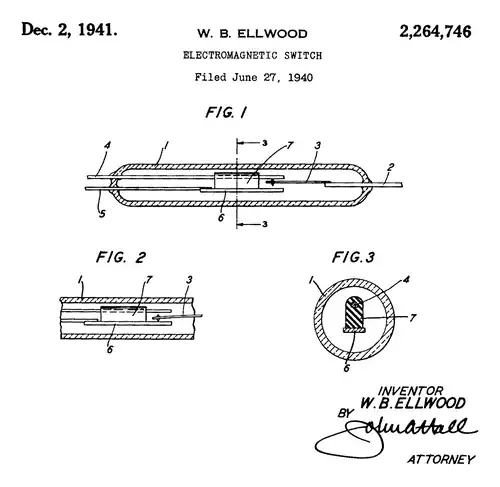 Reed switch diagrams from Walter B. Ellwood's 1941 patent,[4] Electromagnetic switch. It illustrates a single pole, double-throw (SPDT) device. Descriptions from the patent text are as follows: