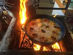 To prepare rellenitos, plantains are cut into medium-sized pieces and boiled with cinnamon until tender. Once they are tender, normally after about ten minutes of cooking time they are removed, mashed into a paste and set aside to cool. The paste is then formed into a small thick tortilla by hand, leaving the center indented resembling a small bowl. The bowl is then filled with a mixture of black refried beans, chocolate and cinnamon. The filling itself is made by melting Guatemalan or Maya chocolate in water and then adding refried beans and cinnamon. The bowl is then closed by wrapping the ends of the tortilla until it closes, creating something that resembles an egg — the plantain paste being the shell, with a black bean, chocolate, and cinnamon filling. The rellenito is then fried in a pan with oil until golden brown on all sides. They are generally served with either honey or powdered sugar on top.[4][5][6]