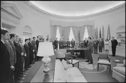 On the return trip to the White House, Nixon insisted on stopping at the United States Capitol, where he took his former seat in the chamber of the U.S. House of Representatives and instructed Sanchez to make a speech.[5][6] Sanchez spoke of his pride in being a citizen of the United States and Nixon and some female cleaners who were present applauded. One of the women present, Carrie Moore, asked Nixon to sign her bible, which he did, and holding her hand told her that his mother "was a saint" and "you be a saint too".[7] Nixon and his group, which now included White House Press Secretary Ron Ziegler and Nixon's Appointments Secretary Dwight Chapin, as well as Tkach, White House Chief of Staff H. R. Haldeman and Sanchez, then ate a breakfast of corned beef hash and eggs at the Rib Room of the Mayflower Hotel.[1][7] Nixon was determined to walk back the last half mile to the White House from the hotel, and aides tried to forcibly grab his arm. Eventually Nixon got into the car.[7]