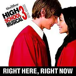 "Right Here, Right Now" is a song from the High School Musical 3: Senior Year soundtrack, performed by Zac Efron and Vanessa Hudgens as Troy Bolton and Gabriella Montez. It is the second track on soundtrack's track listing. When the song is sung in the movie, Troy and Gabriella only sing the first verse, second and third chorus, and the bridge whereas the first chorus and second verse are omitted. However, in the extended edition of the film, the second verse is sung later as the reprise when Troy and Gabriella are at their homes.