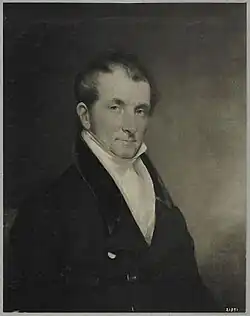 Robert Hallowell Gardiner was born to loyalist refugees from America in Bristol, England in 1782.[1] He inherited his grandfather's estate in 1787; the previous inheritor had been Gardiner's son William, who had received the estate in 1786 but who died suddenly a year later. Robert Hallowell, who was only five years old at the time, took on the name of Gardiner. He graduated from Harvard College and moved to Kennebec in 1803 to manage the land he had inherited.[4] He came with no inclinations or training in business, but his cousin in Hallowell, Charles Vaughan, and Charle's wife, Frances Western Apthorp, a granddaughter of Charles Apthorp, helped acclimate him to American life. Starting at the age of 25, Robert Hallowell Gardiner embarked on the task of developing an entire city, Gardiner, but with profit and investment in mind over the next sixty-one years.