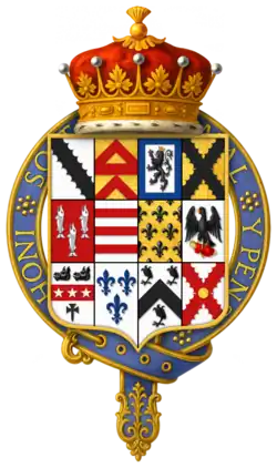 In August 1594 Sussex was sent as ambassador-extraordinary to Scotland with a diplomatic mission and to assist at the baptism of James VI's eldest son, Henry as proxy for Elizabeth I.[1] His companions in Scotland were Lord Wharton, Sir Henry Bromley, Hugh Portman, Henry Guildford, Oliver Cromwell, Thomas Monson, Henry Clare, Edward Greville, Nicholas Sanderson, Edward Gorges, and William Jeffson, with Richard Coningsby and Mr Rolles. The baptism was delayed until the party arrived at Stirling Castle. Sussex had audiences with James VI of Scotland and Anne of Denmark on 29 August and the baptism was held on the next day. Sussex carried the child from his bedchamber to the Chapel Royal and back again. After discussions with James VI about Catholics and Scottish rebels, Sussex left Scotland on 12 September with a gift of silver-gilt plates and was injured by a horse near Northallerton on 14 September.[2]