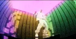 Timberlake dancing inside a cube surrounded by an array of colored light