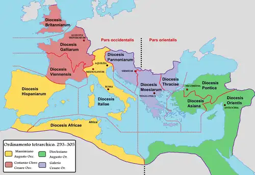 For centuries, it was the largest administrative unit of the foreign possessions of ancient Rome.[1] With the administrative reform initiated by Diocletian, it became a third level administrative subdivision of the Roman Empire, or rather a subdivision of the imperial dioceses (in turn subdivisions of the imperial prefectures).[1]