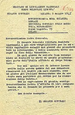 Immediately after Italy's Liberation, on 5 May 1945, General Raffaele Cadorna, who then commanded the CVL, sent a letter of thanks to the nun.[1] Italian parliamentarian Enrico Mattei spoke extensively of this letter in a report to the 1st National Congress on 24–28 April 1946. In part, the letter read,
