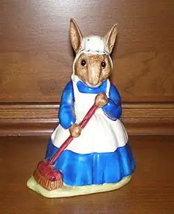 Royal Doulton Bunnykins tableware and figurines are popular ceramic designs manufactured as nursery dishes and collectible figurines. The chinaware line originated with artwork by Sister Mary Barbara Bailey (née Barbara Vernon Bailey), the daughter of Cuthbert Bailey, general manager of Doulton during the 1930s. Unbeknownst to the public, Mary Barbara Bailey was not a professional illustrator, but a nun in the Augustinian Canonesses of the Lateran.[1] Sister Mary Barbara provided illustrations to the designers of Doulton & Co. to be used on tableware. Six Bunnykins figurines were produced based on Sister Mary Barbara's illustrations in 1939 and were designed by Charles Noke. Discontinued during World War II, Bunnykins figurines were not reintroduced until 1969. Bunnykins continued to be produced in England until 2005. Bunnykins figurines and tableware are currently produced in Asia.
