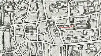 In a judicial act of 1243 it was known as the Rue André Machel after its owner.[1] It was later renamed the Rue de l'Encloître Saint-Benoist[5] then the Rue du Cloître Saint-Benoît since it served the église Saint-Benoît-le-Bétourné.[1] Around 1280-1300, it was mentioned in Le Dit des rues de Paris by Guillot de Paris as en Cloistre Saint-Beneoit le bestourné.