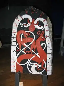 Today, most runestones are painted with falu red, since the colour red makes it easy to discern the ornamentation, and it is appropriate since red paint was also used on runes during the Viking Age.[60] In fact, one of the Old Norse words for "writing in runes" was fá and it originally meant "to paint" in Proto-Norse (faihian).[61] Moreover, in Hávamál, Odin says: "So do I write / and colour the runes"[60][62] and in Guðrúnarkviða II, Gudrun says "In the cup were runes of every kind / Written and reddened, I could not read them".[63][64]