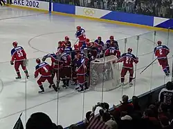 The Russian men's national ice hockey team (Russian: Сборная России по хоккею с шайбой) is the national men's ice hockey team of Russia, overseen by the Ice Hockey Federation of Russia. As of 2021, they were rated third in the IIHF World Ranking.[4] The team has competed internationally from 1992 until it was provisionally suspended in 2022, and is recognized by the IIHF as the successor to the Soviet Union team and CIS team. Russia has been one of the most successful national ice hockey teams in the world and a member of the so-called "Big Six," the unofficial group of the six strongest men's ice hockey nations, along with Canada, the Czech Republic, Finland, Sweden, and the United States.[5] The European nations of the Big Six participate in the Euro Hockey Tour, which Russia won nine times since 2005.[6] Since September 2021, the head coach is Alexei Zhamnov, who took over from Valeri Bragin.[7]
