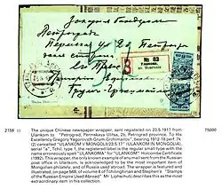 Mail from some of the post offices is scarce. There is only one known piece of mail from the Russian post office in Ulankom,[1] for instance, which was discovered by Michel Liphschutz in the 1940s.
