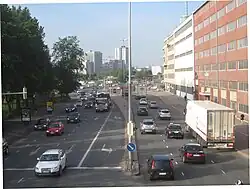Earlier, Sörnäisten rantatie was mostly an interior street in the industrial and harbour area, with a railway track branching off from the Sörnäinen harbour rail to the Hakaniemi market square running along it.[1] It was started to expand to a larger traffic road in the early 1950s when the new Kulosaari Bridge was being constructed. The Hakaniemi bridge was completed in 1961, connecting Sörnäisten rantatie to Pohjoisranta in Kruununhaka and onwards to the South Harbour. As traffic originally went via Hakaniemenranta to the Pitkäsilta bridge, the Hakaniemenranta street remains a four-lane street to this day, even though the traffic does not support this any more.