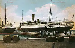 HAPAG transferred Fürst Bismarck to its route between Italy and Hoboken,[1] and then to its route was between Hamburg and Vera Cruz in Mexico via Havana, Cuba, which she worked with her sister ship Kronprinzessin Cecilie. She left Hamburg on her first voyage on this route on 10 January 1906.[1] Early in 1908 Fürst Bismarck made at least one crossing from Hamburg to Hoboken.[12] On one voyage she left Havana on 21 December 1909, and grounded in fog off Octeville on the Cotentin Peninsula of France on 6 January 1910. Her crew jettisoned part of her cargo, and she was refloated on 8 January.[13][14] By 1910 she was equipped with submarine signalling and wireless telegraphy.[15]