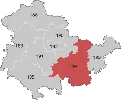 Saalfeld-Rudolstadt – Saale-Holzland-Kreis – Saale-Orla-Kreis is an electoral constituency (German: Wahlkreis) represented in the Bundestag. It elects one member via first-past-the-post voting. Under the current constituency numbering system, it is designated as constituency 194. It is located in eastern Thuringia, comprising the districts of Saalfeld-Rudolstadt, Saale-Holzland-Kreis, and Saale-Orla-Kreis.[1]