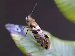 Sabatinca aurella is a species of moth of the family Micropterigidae.[1] It is endemic to New Zealand. The larvae of this species are variable in appearance but tend to be coloured yellow-green with greyish patches. The adults of the species have a pale golden appearance with silver or purple coloured bars on the forewings. The moth has an approximate wingspan of around 1 cm. This species is found from the Coromandel Peninsula to the Fox Glacier and is on the wing from September to January. A larval host species is the liverwort Heteroscyphus lingulatus. The preferred habitat of this species is at higher altitudes than other New Zealand endemic species in this genus; and the moth tends to prefer forest or subalpine grass or scrubland.