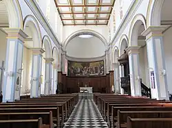 Constructed according to the plans of an engineer called Paradis on the site of a church that had preceded it in the 18th century, the first foundation stone was laid on 4 November 1829, by the governor of Penfentenyo. Despite being consecrated as a cathedral in 1860 by Monsignor Maupoint, bishop of Saint-Denis de La Réunion, it did not take its final form until 1863 with the construction of the western porch in the prostyle style and the later addition of a bell tower.[5] The whole building was registered as a monument historique on 13 October 1975.