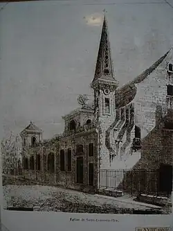 The first stone was placed on 1 October 1664 by the Archbishop of Paris, but work was delayed by a shortage of funds and other mishaps. The architect died soon after the project began, and was replaced by Gabriel Le Duc and then by two more architects in succession. A wind storm in 1701 destroyed the new roof.[5] Due to the long delays, houses were built next to the church, taking the space originally intended for the traditional west front, which had to be relocated. The church was not completed until 14 July 1726, sixty years after the beginning of its construction.[5] The original bell tower was destroyed by a storm in 1740, and was replaced by a new openwork tower, which allowed the strong winds on the island to pass through. Another unusual feature of the tower is the clock, which hangs over the street like a shop sign.[6]
