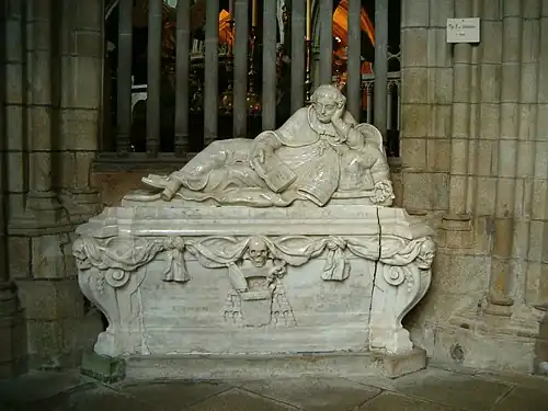 This white marble tomb, located in the choir area of the cathedral, is that of Monseigneur François de Visdelou. It is the work of the sculptor Nicolas de la Colonge and was executed in 1711. François de Visdelou was the confessor of Anne of Austria, the mother of Louis XIV. The gisant depicts de Visdelou reclining on a couch. The monument was saved from total destruction during the Revolution although the coat of arms was chiselled away and a finger of his right hand bearing his ring was also broken off. François de Visdelou was the Bishop of Léon from 1662 to 1668. There are two inscriptions on the tomb. One reads "Franciscus. Visdelou. Leon. epus.et.comes.Annae Austriacae.Gal.reginae conclonator. et eps.Madurae.Dein.epi.Consop.coadjuter. demun.leonem.eps et comes. Obit XV!!! mart.an.MDCLXXI" and the second inscribed on the mitre reads "NICOLAS DE LA COLONGE MDCCXI".[35][36][37]