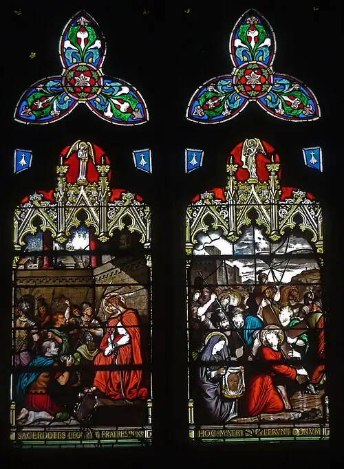 The window honouring Roland de Neufville. Dating to 1883 the stained glass window is by Lobin working with the Carmel factory in Mans. The likeness of Monseigneur de Neufville is based on an illumination depicting the bishop in a missal held in Lyon.[40]