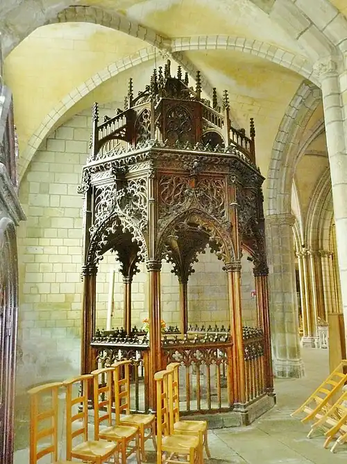 In the Middle Ages, religious wood carving played an important role in ecclesiastical architecture and those in the cathedral date to the 16th century. There are 33 stalls on each side of the choir, 17 in the higher range and 16 lower down and each has been carved with a variety of depictions with representations of foliage, strange animals, dragons and amusing subjects. The first stall on the epistle side bears the arms of Bishop Monseigneur Carman, the Bishop of Léon from 1504 to 1514 and the first stall on the gospel side bears the arms of Bishop Monseigneur Guy Le Clerc, the Bishop of Léon from 1514 to 1523.[4] [26]