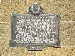 Paete was established as town in 1580 by Franciscan priest Fray Juan Plasencia under the patronage of Saint Lawrence.[1][2] Due to the scarcity of religious men, it was annexed to the visita of Lumban until October 20, 1600, and to Pangil until 1602.[1] The first parish priest of Paete, Fray Pedro de Buenaventura, was appointed in 1602.[1] The first stone church and convent were built by Paete natives under the supervision of Fray Andres de Puertellanoin 1646 but it was later destroyed by an earthquake in 1717.[2] A new stone church was started the same year under Fray Francisco de la Fuente.[2][3] It was completed in 1840 under the term of Fray Luis de Nambroca.[3][4] The church and convent were again destroyed by the 1880 Luzon earthquake.[2][5] Father Gregorio Martin built a temporary small church of 33 m (108 ft) by 13.2 m (43 ft) by 8.6 m (28 ft).[6] In 1884, the church was rebuilt under Father Pedro Galiano, now facing the Laguna lake but this was again destroyed by another earthquake on August 20, 1937.[2] The church served as a dungeon and torture house to the people of Paete during the Japanese occupation of the Philippines in World War II.