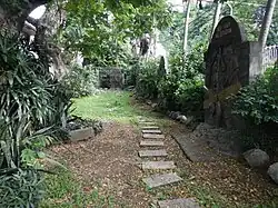 A small garden, named the "Garden of Gethsemane", was located at the right side facing the church entrance and was designed for devotees who want to meditate or pray. It contained 14 life-size bas-relief of the Stations of the Cross, a "Well of Repentance" or Balon ng Pagbabalik Loob, and a statue of John the Baptist. These were demolished in 2019 to make way for the restoration of the church patio.