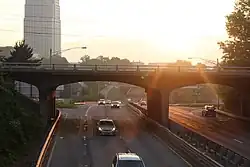 On January 6, 1958, the first 1.2-mile-long (1.9 km) section of the East–West Expressway was opened between Cloverdale Avenue and Main Street.[4][5] Because of the novelty, local newspapers ran a series of stories and diagrams on how to use the expressway, educating the public on how on-ramps and off-ramps work.[2] Designated as I-40, the expressway soon ran concurrently with US 158 in 1959, from Stratford Road to Marshall (westbound) and Cherry (eastbound) streets.[6] In 1960, the expressway was extended west into Yadkin County, at NC 801, and east to Reidsville Road.[7] In 1961, US 421 was rerouted from Pfafftown and downtown Winston-Salem onto new freeway that connected directly with the expressway, then continued easterly running concurrently with I-40.[8] In 1962, US 158 was realigned to continue along the expressway to Reidsville Road, its former alignment became US 158 Business (decommissioned in 1970). East of Reidsville Road, I-40/US 421 was extended onto new freeway to Kernersville, where it then linked with second built section of I-40 (late 1958) and continued towards Greensboro.[9]