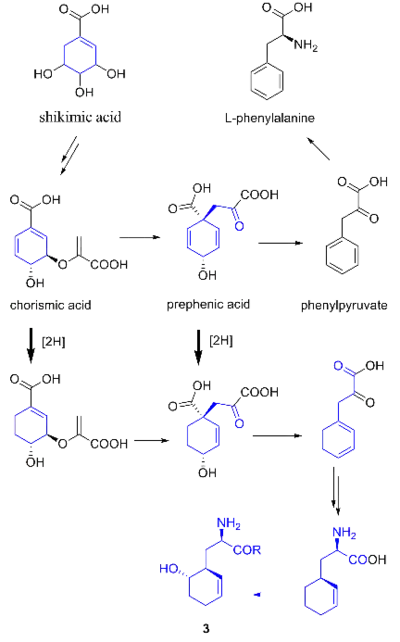 While they share the biosynthetic precursors acetate and presumed β-hydroxycyclohex-2'-enylalanine (3), they differ in the origin of the four-carbon building block that gives rise to their structural differences involving the halogen atom. A hybrid polyketide synthase-nonribosomal peptide synthetase (PKS-NRPS) pathway is most likely the biosynthetic mechanism in which acetyl-CoA and butyrate-derived ethylmalonyl-CoA condense to yield the β-ketothioester (4), which then reacts with (3) to generate the linear precursor (5).