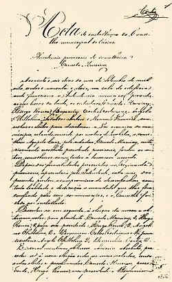 He was praised by several distinguished personalities of the city as a firm leader in the times of social, political, and military unrest at the end of the century, amidst the difficulties of settling the colony, the turmoil of the Federalist Revolution, and the settler revolts that marked the early history of Caxias do Sul. He was an honorable man and servant of the public cause, a patriot, one of the founders and one of the first organizers of the city, and today he baptizes a street.[31][23][1][19][2][32] Mário Gardelin, one of the main local historians, in the second edition of his monumental Povoadores da Colônia Caxias (2002), written in partnership with Rovílio Costa, described him as "a personality of great importance in the life of Caxias", and regretted that such an illustrious figure has not yet been biographed.[33] In the same year, during the solemn session that celebrated the 110th anniversary of the installation of the Legislative Power in Caxias do Sul, with the presence of a great number of authorities, a plaque reproducing the minutes of the installation of the first Council was unveiled at the City Hall, where his name and the names of the other first councilors of the city are inscribed.[34]