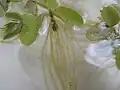 Salvinia natans has two nickel-sized leaves lying flat against the surface of the water, and a third submerged leaf which functions as a root. Flotation is made possible by pouches of air within the leaves. Cuticular papillae on the leaves' surface keep water from interfering with the leaves' functioning, and serve to protect them from decay. Spore cases form at the plant's base for reproduction.[4]