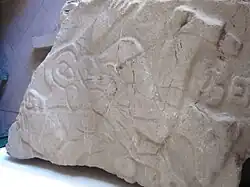 A flat, carved stone, designated Monument 3, was placed as a doorstep to the ceremonial structure (Price and Feinman 2005, p. 321). The carving is of a naked man with "a puffy, slitted eye, lips drawn back in a grimace, overall posture of vulnerability ... rounded elements on the chest and abdomen suggesting the guts after disembowelment."[5] Glyphs depict drops of blood and a possible calendar day-name "1 Earthquake." These are the earliest Zapotec glyphs known to exist. While personal bloodletting was suggested by the stingray spines and similar objects made of obsidian or jade, the figure depicted on Monument 3 shows sacrifice of a victim, probably a captive, on a societal level.[5] In a later time period, monuments carved with similar figures, called danzantes (dancers), were present at Monte Albán.[6]