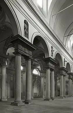 In 1828, the convent and church were bought by the city. After deconsecration and until the Second World War, the church and the monastery was used as barracks, hospital, and warehouse.[2] The interior of the church is decorated with frescoes by Trotti; Procaccini ; Nuvoloni; Bartolomeo Baderna; Gian Paolo Lomazzo (Refectory, 1567); Antonio Cifrondi; and Rubini .[5] The site is now deconsecrated and was used for exhibitions until 1985, and again since 2019.[6]