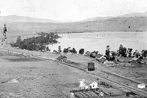 In 1870, James Uren purchased the W.H. Kay stopping house, which he refurbished and later extended.[50] In the early 1870s, James Sabiston operated a store.[51] Uren managed the HBC warehouse 1873–1878,[52] which held freight awaiting lake transport to Kamloops.[41] About 1882, he renamed the lodgings as Savona House.[52] John Jane's general store, which opened in 1881, soon faced competition from the various stores across the lake which sprang up to serve the CP construction crews.[53] Around this time, Abraham Thomas opened a saloon, which became known as the Central Hotel.[54] In fall 1883, James A. Newland and Adam B. Ferguson opened a hotel called Lakeview House,[55] which thrived during the CP construction period.[56] The location of the cemetery on the north shore suggests its existence by this time.