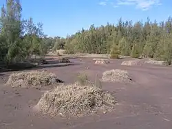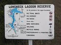 The Longneck Lagoon area is located in the north west corner of the park and surrounds Long Neck Lagoon. Aside from its important natural values as a wetlands and vegetation reserve containing endangered and vulnerable species, the area contains earliest evidence of one colonial use associated with the park when it was still the Pitt Town Common. The large sandstone quarry located between the end of Phipps Road, Cattai Road and the Longneck Lagoon Field Studies Centre commenced operation in the mid 19th Century and continued well into the 20th Century after the Common was decommissioned. Stone from the quarry was used in local buildings such as St James Anglican Church and Bona Vista Homestead at Pitt Town.[4]