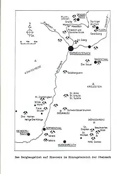 3. ^ Heimatbeilage zum Oberfränkischen Schulanzeiger No. 309 dated November 2003: Gustav Schmidt: Einstiger Erzbergbau und entsprechende Verhüttung in Nordost- und Ostoberfranken on page 34 in the illustration: “Das Bergbaugebiet auf Eisenerz im Einzugsbereich der Steinach“