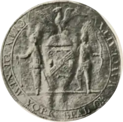 In 1683, the city's Common Council petitioned the colonial governor of New York for an official charter, including the right to designate their own seal. In 1686, the charter was granted. It included the right of the city to "breake Change Alter and new make their said Comon Seale when and as often as to them it shall seem convenient".[13] The city's Common Council then adopted a new seal on July 24, 1686, the first to be designed and approved by the city in its own right. The design contained many elements that survive in the current city seal—namely, a shield featuring windmill sails, beavers, and flour barrels, a colonial sailor and a Native American as supporters, a Latin legend, a founding date (in this case, 1686 was used), and a laurel wreath. The first known use of the 1686 seal reveals that the seal featured a ducal crown at the crest, a fact that has puzzled historians, since the city's owner and namesake, James II, had ascended to the throne of England in 1685, and thus the use of an imperial crown would have been warranted. Subsequent uses of the seal show that a change to an imperial crown was made, although the exact date of the change is unknown.[14]