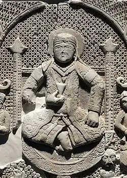 Enthroned figure usually identified as the last Seljuk ruler Tughril III (1176–1194), from Rayy, Iran. Philadelphia Museum of Art.[61][62]
