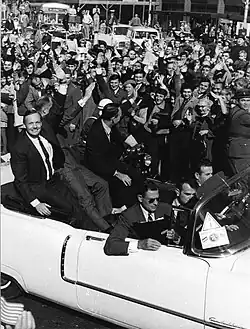 The Yugoslav government of the newly formed FR Yugoslavia (one of successors to SFR Yugoslavia) ended up having three ideologically-opposed leaders occupying executive positions. From 1992, while Slobodan Milošević was the president of Serbia, national theorist Dobrica Ćosić was named President of FR Yugoslavia. Meanwhile, Milan Panić, a business magnate based in Newport Beach, California, accepted Milošević's invitation to be Prime Minister of FR Yugoslavia.[55] Panić was subsequently elected as prime minister in the 1992 Yugoslav parliamentary elections. The United States did not revoke Panić's citizenship even though his occupation of an executive position in the Yugoslav government clearly contradicted the United States Constitution.[56] Nevertheless, Panić would become a person of interest in US diplomatic circles, given his business and residence backgrounds. At a CSCE meeting in Helsinki in July 1992, US Secretary of State James Baker abruptly dismissed Panić's appeal to reduce the sanctions to Yugoslavia, even after an agreement (between Panić, Milošević, and Dušan Mitević) was reached by which Milošević would resign in return for sanction-relief. This ended up severely damaging Panić's unique diplomatic position internationally, as well as his standing in Yugoslavia. The Los Angeles Times published an article which described Panić as a doubtful upholder of potential American-Yugoslavian peacemaking,[57] when in fact, many years later made to be known, Panić was actually invited by Baker in the first place rather than voluntarily coming to Helsinki.[58]