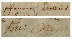 John Pym Yeatman is another who considered that the body of the will is in Shakespeare's handwriting. In his book, Is William Shakespeare's Will Holographic? (1901), he argues against the often repeated idea that Francis Collins (or "Francis Collyns" as it is often spelled), Shakespeare's lawyer, wrote the will. Among the evidence that Yeatman offers, is Collins' signature on the will itself. Collins' name occurs three times in the will: twice in the body, and the third time when Collyns signs his name at the bottom of page three. The body of the will, along with Shakespeare's own signature, are written in handwriting known as the secretary hand, whereas the signature by Collins, particularly the initial letters, is written in a modern hand. The difference between the two handwriting styles is primarily in the formations used for each letter of the alphabet. Yeatman then states that the last insertion regarding the second-best bed, is in a handwriting that "exactly corresponds with the signature below it." This he adds, is "of the utmost value, in proof that one hand wrote them both."[39]